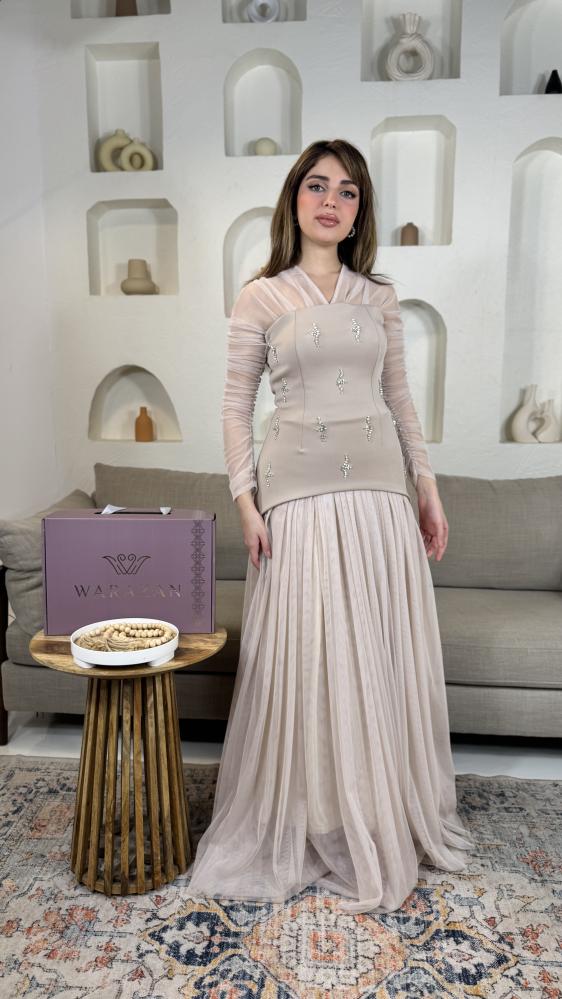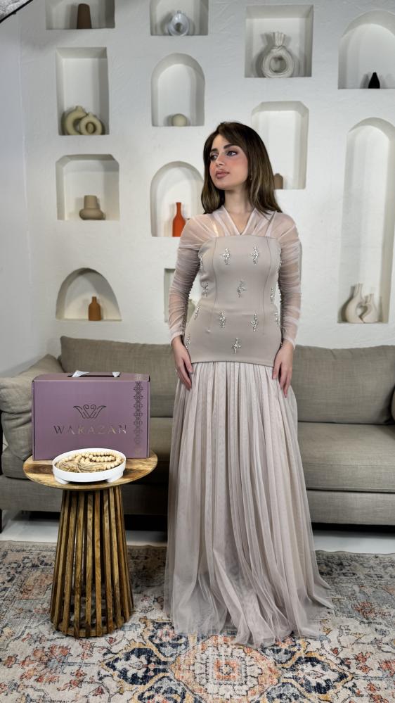 فستان طويل ناعم بتطريز واكمام تل