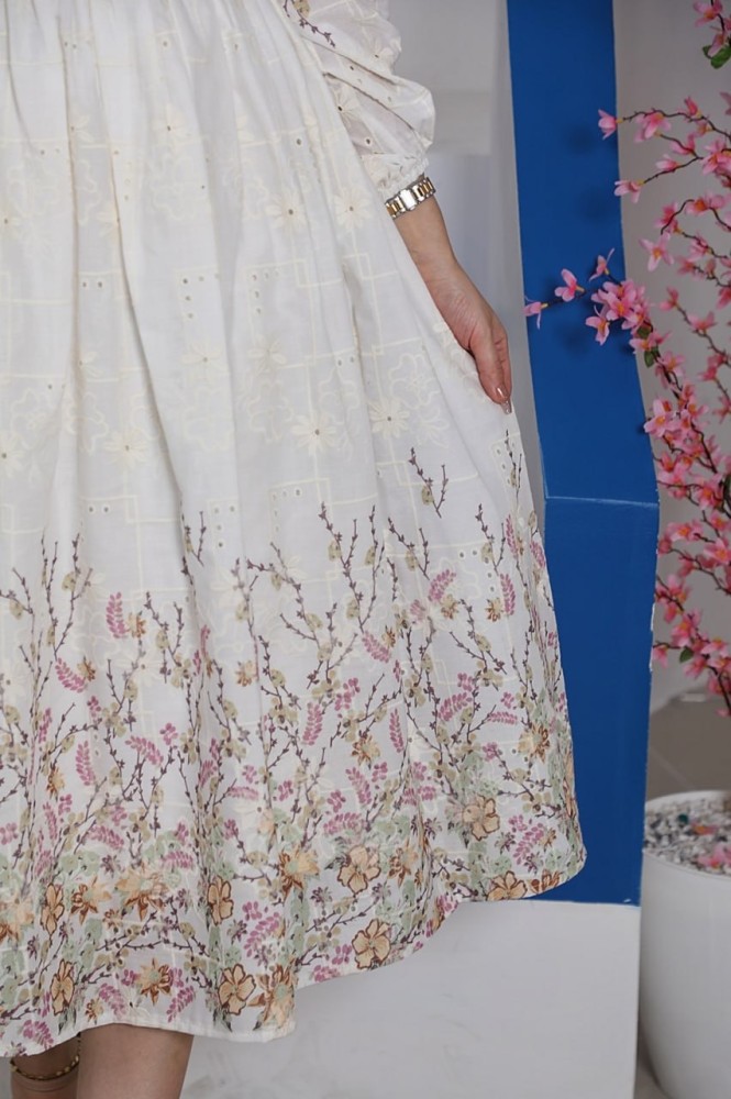 فستان طويل ناعم بتطريز واكمام تل