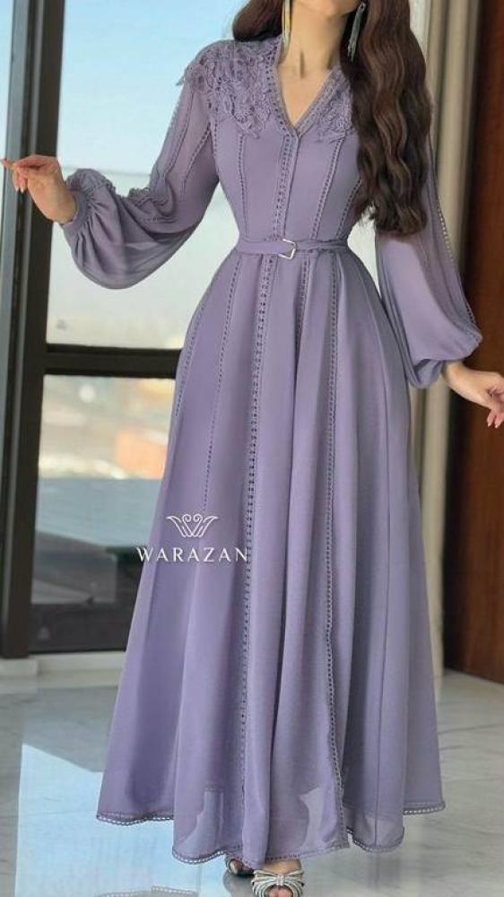فستان ناعم باكمام واسعه و كرستال من الكتف