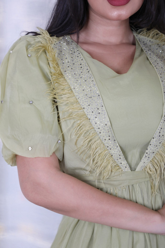 فستان ساتان بتطريز و ريش
